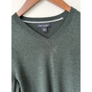 The product is a Banana Republic men's sweater made from 100% extra fine wool in a size small. The sweater features a V-neckline, long sleeves, and a green color. It is designed for various occasions such as travel, casual wear, and business, with a regular fit and pullover style. The Italian, classic, and preppy themes make it a versatile piece for the winter, fall, and spring seasons.