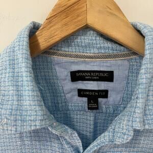 Banana Republic Men's Blue Button Up Camden Fit Linen Top Size Large. Excellent condition, like new. Blue lined print. Collared. Full button up top. Long Sleeve. Front chest pocket.