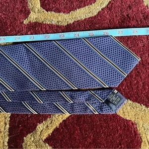 Deep purple with navy blue, black, cream, and chocolate brown makeup this handsome tie, which is in EXCELLENT condition! No holes, stains, or snags.