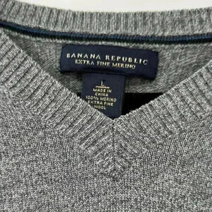 pgrade your wardrobe with this Banana Republic men’s gray V-neck pullover sweater in size L. Made from 100% extra fine Merino wool, this sweater offers luxurious softness, lightweight warmth, and timeless style. Perfect for layering over a shirt or wearing on its own, it’s ideal for both casual and formal occasions. The classic gray color adds versatility to your collection, making it a must-have piece for any season.