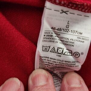 Material content is 96% Cotton, 4% Lycra Spandex. Per label recommendation, machine wash in cold water.