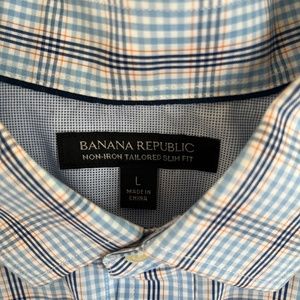 Banana Republic Men's Long Sleeve Button Down Dress Shirt - Size L 16 - 16.5 - Non-iron Tailored Slim Fit - Blue/Navy Check pattern with gold/orange accents