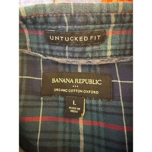Keywords: Banana Republic, mens shirt, long sleeve, button down, plaid, untucked fit, casual shirt, blue, green, organic cotton oxford, button-up shirt, men's clothing