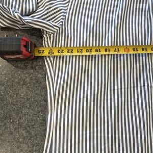 The Banana Republic Men's Long Sleeve Button Up Shirt in XL size features a classic white and grey striped pattern, made from 100% cotton woven fabric. This collared shirt with a button closure is suitable for various occasions, including office, casual, and career settings. Ideal for all seasons, this shirt is machine washable and offers a 2-ply fabric construction for added quality and durability. Perfect for the modern man looking for a versatile and stylish addition to his wardrobe.