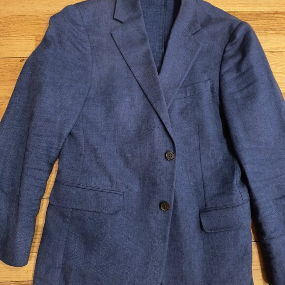 Jacket: Size 38R (small). "Tailored Fit." 2-Button closure. Breathable Linen/Cotton blend.