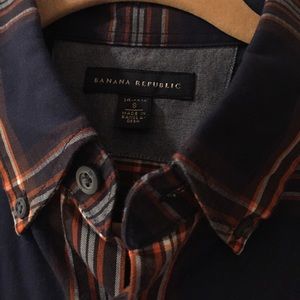 Navy and Orange/Burgundy Banana Republic button down shirt. Men's size Small. Perfect condition! My hipster hubby probably only wore this once :) Great steal!