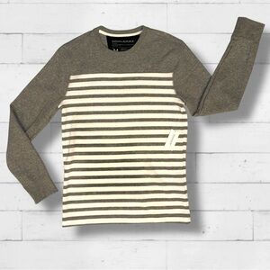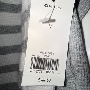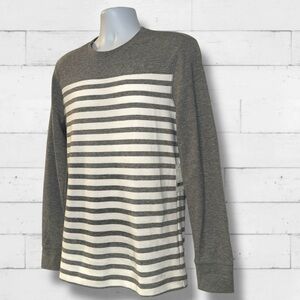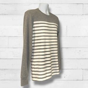 New with tags (original retail $44.50), this timeless piece features a classic crewneck design with horizontal gray and white stripes for a versatile, modern look.