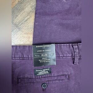 Stylish and versatile NWT Skinny fit 35x36 in purple. Perfect for casual or business casual occasions with belt loops with a suede material. They aren’t as dark purple (the lighting makes them look slightly darker) the color shows the best is the 3rd and 4rth photos.