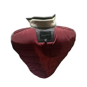 Banana Republic men’s quilted puffer vest in size XL. Features a two-tone design with medium gray body, darker contrast yoke, and maroon interior lining. Full zip front with stand collar, horizontal quilted panels, and side pockets. Lightweight yet warm, perfect for layering in cool weather or casual outings. Made of cotton, polyester, and nylon blend shell with polyester lining and fill. Pre-owned and in excellent condition with no stains, holes, or major signs of wear. Stylish and practical wardrobe staple for fall and winter.