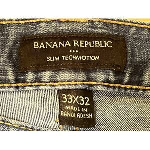 Banana Republic Men’s Slim Techmotion Jeans in size 33x32 are made of denim with a medium distressed wash. These straight fit jeans feature a slimming and stretch design, with a 5-pocket style and a mid-rise waist. They have a zip and button closure, and are suitable for winter, fall, and spring. The jeans are in a solid blue color and are machine washable. The brand is Banana Republic, and the model is Slim Techmotion.