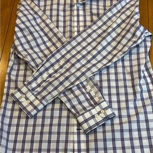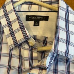 Elevate your wardrobe with this Banana Republic men's shirt. Featuring a stylish white and blue plaid design, this shirt offers a non-iron, tailored slim fit for a polished look. Used excellent condition