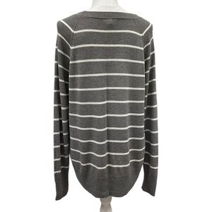 Boat neck, long sleeve sweater. Front hem is higher that back hemline. Raglan sleeve. Side seams wrap forward for shape.