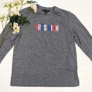 Super cute gray crew neck fine Merino wool sweater with embroidered Tres Bien by Banana Republic.