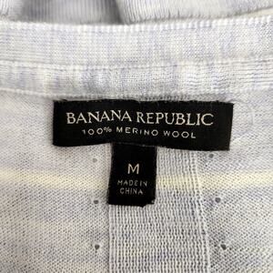 banana republic, merino wool sweater, pastel stripe knit, v-neck pullover, lightweight layering piece, soft wool knit, perforated neckline detail, long sleeve sweater, size medium, quiet luxury style, timeless wardrobe staple, 1989 blue