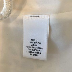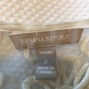 Off white top with pearlized/silver metallic embroidery on sheer fabric. Lined from bust down. Fitted through back. Size 2 petite. Measures approximately 17" armpit to armpit and 24" shoulder seam to hem.