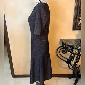 Rare and difficult to find! This is a stunning, elegant dress with 1/2 length sleeves and a figure flattering A-line, fit and flare midi length design. The fabric is a light sweater material and looks to the eye like a metallic bronze-y black/gold/copper color with just the right amount of subtle sparkle. Interestingly, the official color name is “Twilight Navy”. It doesn’t have an obvious navy undertone- it’s always looked like bronze brown / black to me. But knowing it’s really a super-dark navy, I can kind of see that too under certain lighting. It’s a difficult color to describe, but an impossible one to ignore… it’s truly unique and just gorgeous! This dress was from the Holiday 2018 collection by Banana Republic.
