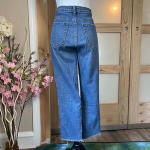 Banana Republic mid-rise, ankle-length jeans in a dark wash with frayed hem detailing. The size is unknow as tags were removed - Please see measurements below for an accurate fit.