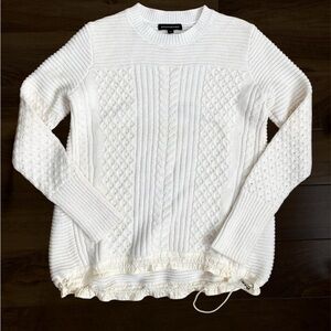 Experience warmth and style with this Banana Republic cream sweater, featuring a classic crew neck and intricate cable knit design. The full-length sleeves and textured pattern add a touch of elegance to your outfit in each wear.