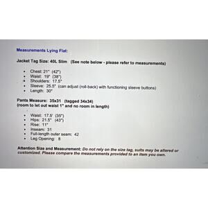 Attention Size and Measurement: Do not rely on the size tag, suits may be altered or customized.