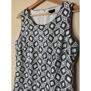 EEUC Banana Republic Monogram Black and White Geometric Pattern Sequin Dress Size 10. This is from the BR Limited Design Line. It has a sleeveless shift design, a hidden zipper up the back, and a hook-and-eye closure. It is beautiful, flattering, and very fun! It is completely covered in sequins to give it a unique and fun design, and it has a black trim outline.