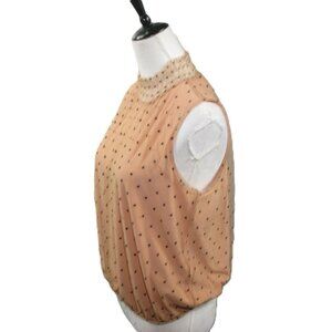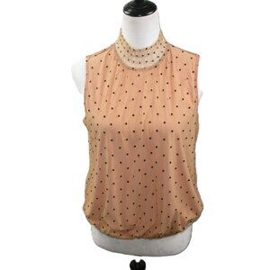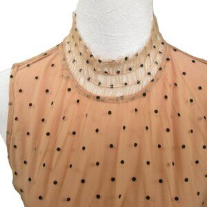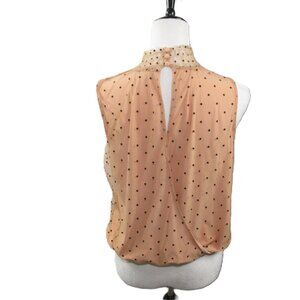 This tank blouse is new without tags, no notable flaws. It has a sheer polka dot overlay with a sheer mock neckline. The back has a faux wrap design with a keyhole cutout with three button closure at the neckline.