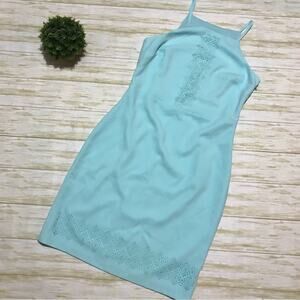 This dress is new with tags! Light blue color. Cut out laser cut details. Halter neckline. Sheath pencil dress style. Knee length. Women’s size 6. 5.6.23 GG