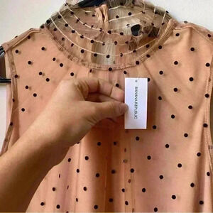 Brand new with tags Banana Republic pink mesh top with black polka dots, size extra small. This stylish top features a button closure at the back of the neck for added elegance. Made of 95% polyester with a 100% nylon shell and 5% spandex, it’s lightweight and comfortable.