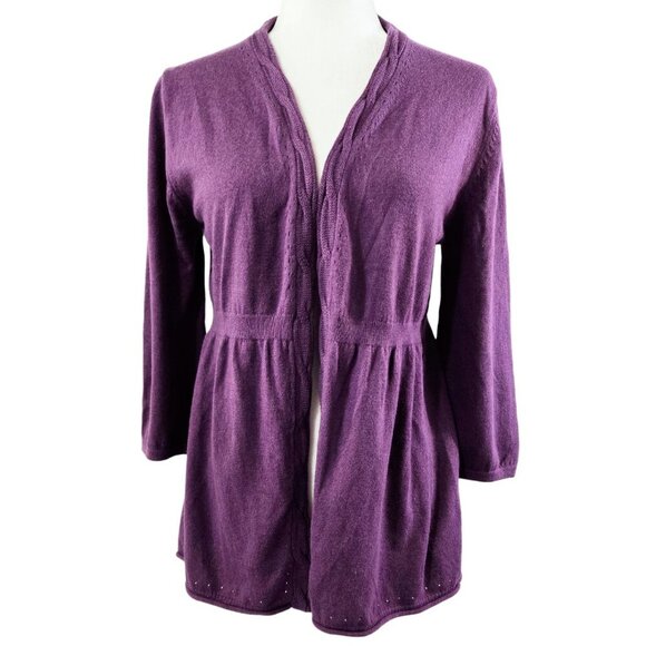 New with tag. A soft purple open front cardigan, with 3/4 sleeves. Has subtle pointelle trim along the edge. Perfect for layering.