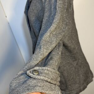 Stay cozy and stylish with this Banana Republic women's pea coat in a soft gray cotton blend. This double-breasted jacket features a classic nautical style, functional flap pockets, and a rolled cuff sleeve detail for a relaxed, structured look. Lightweight with stretch for comfortperfect for layering in transitional weather or a mild winter.