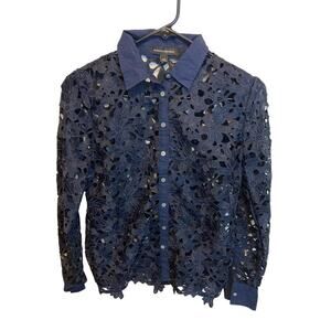 Banana Republic Navy Blue Lace Floral Eyelet Overlay Button Up Blouse Size XS