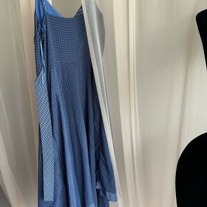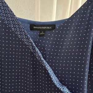 Chic navy blue midi dress with subtle dot pattern. Features a wrap style and delicate straps. Ideal for versatile styling.