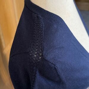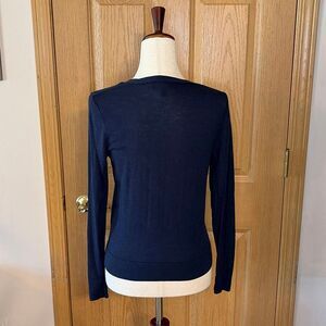 This sweater is made by Banana Republic. It’s a navy blue silk cashmere blend cardigan with details on the shoulders down the length of the sleeves. Size small and in great pre owned condition. Smoke and pet free home.