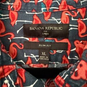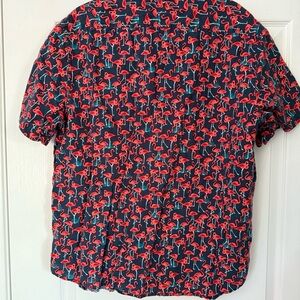 Navy shirt with red flamingo design. Perfect for casual outings. Features short sleeves and button-down front. Men’s size XL, slim fit cut. Perfect for some fun in the sun ☀️