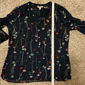 Chic navy blouse with colorful floral design. Lightweight and stylish. Ideal for versatile wear.