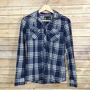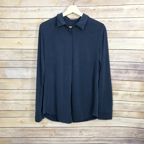Excellent pre-owned condition. Lightweight & flowy navy button down shirt from Banana Republic. Long sleeves with buttoned cuffs, and hidden button placket Machine wash. 65% Modal, 35 Polyester. "A relaxed, fit shirt, made in a customer favorite, modal-blend jersey that has been specially washed to create a lightweight top with a beautiful drape and silky soft feel."