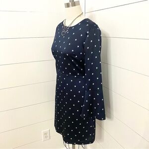 Banana Republic Navy Pearl Graphic Novelty Print Back Neck Tie Sheath Work Midi Power Dress, Capsule Professional Feminine Buttery Soft Silky Chic Women’s Size 8