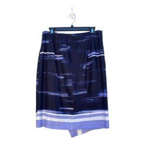Great statement piece for any wardrobe. Brush stroke printed, draped navy, purple & white linen blend faux-wrap pencil skirt. Faux wrap/crossover style. Linen blend. Hidden side zip. Size 6- 15.5” across waist. 24” long. Preowned-great condition, no stains, rips or tears.