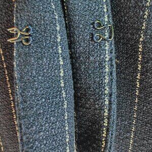 Chic navy blazer with subtle white pinstripes and raw fringe trim at cuffs and hem. Features hidden hook-and-eye closure, full lining, and a structured yet comfortable tweed-like texture. Perfect for work, events, or elevating casual looks with a tailored touch.