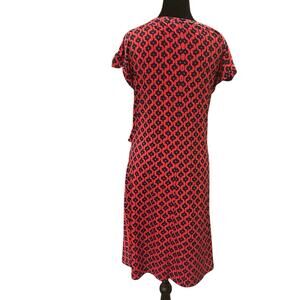 Banana Republic navy blue and red geometric print jersey dress in size Medium. Features a flattering ruched side detail, soft stretch knit fabric, and a tailored silhouette that’s perfect for work, dinner, or weekend outings. Comfortable and wrinkle-resistant, making it a great travel or office essential.