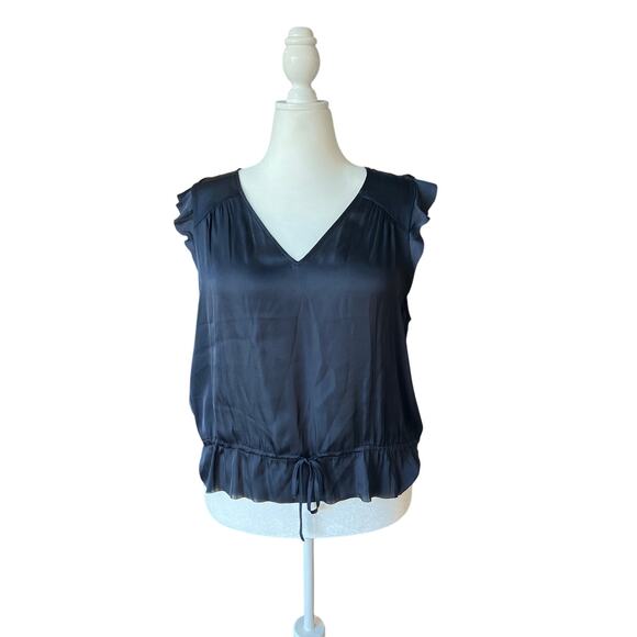 Banana Republic Navy Ruffled Sleeveless Blouse Womens Size XL Silky Satin Career