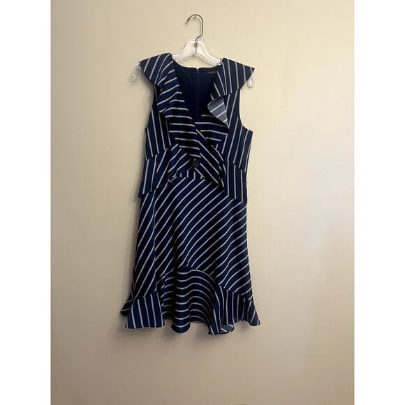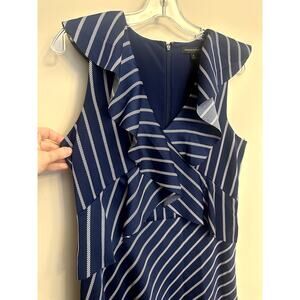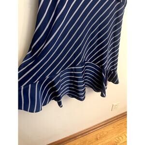 Gorgeous and super flattering Banana Republic sleeveless ruffle-front dress in a navy/white stripe pattern. Features a soft v-neck, cascading ruffles, and a flowy asymmetrical hem for a feminine, polished look. Perfect for work, brunch, weddings, or summer events. Zip-back closure. Great condition!