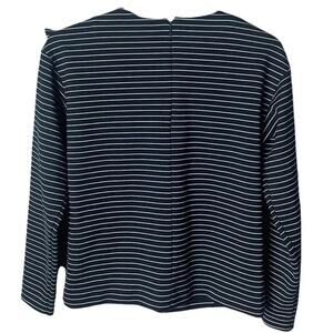 Chic navy and white striped blouse. Features a unique bow accent. Perfect for any occasion.