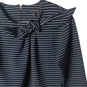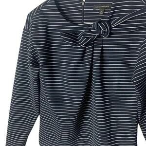 Chic navy and white striped blouse. Features a unique bow accent. Perfect for any occasion.