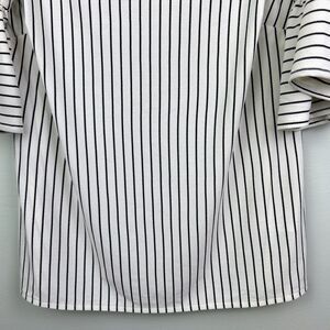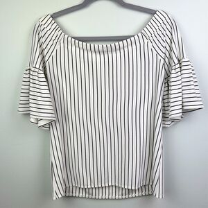 Banana Republic Off the Shoulder top in a black and white pinstripe pattern with fun flared bell half sleeves. Cute, flirty, and feminine shirt perfect for dressing up any outfit! Excellent used condition. Women's size S small, measurements pictured.