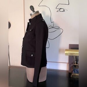 This Banana Republic Officer's Jacey jacket is a true masterpiece. Featuring a beautiful deep black color with silver ornamental buttons, this piece exudes timeless elegance. Crafted with high-quality materials, it is in absolutely perfect condition. I'm selling it because it's now too small for me. A must-have addition to your closet, this jacket offers a touch of classic sophistication for any wardrobe.