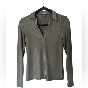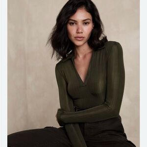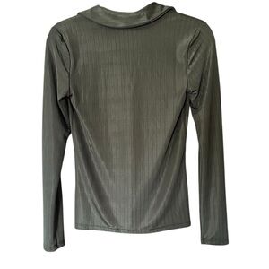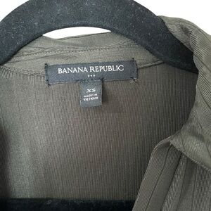 This sleek olive green satin ribbed long sleeved shirt from Banana Republic features a fitted design with a classic polo collar. Its style ensures a smooth silhouette, making it a versatile choice for both professional and casual settings. Excellent condition, no flaws. Pet and smoke free home.