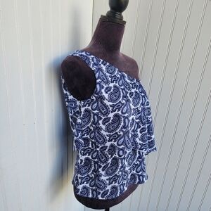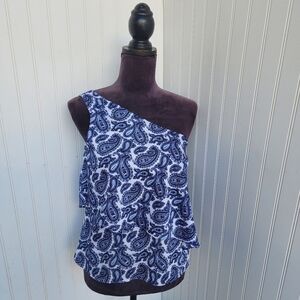Banana Republic One Shoulder Paisley Print Blouse top Blue white Satin Sz 0