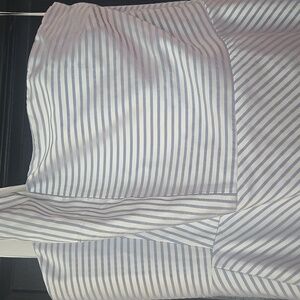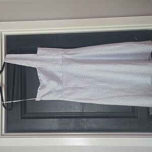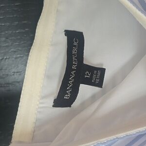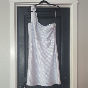 Banana Republic white and blue striped one shoulder satin fit and flare dress. Size 12. Zips up the side. Fully lined. Has silicone strip along the inside the top of the dress to help keep it in place. 100% polyester satin. The material doesn't have any stretch. Excellent pre-owned condition. No flaws, tears, holes, or stains. Perfect for date night, dinner parties, work parties, cruise, resortwear, graduation, etc. A classic dress!
