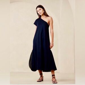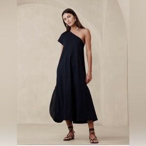 Elegant one-shoulder midi dress. Perfect for evening wear. Flattering silhouette.