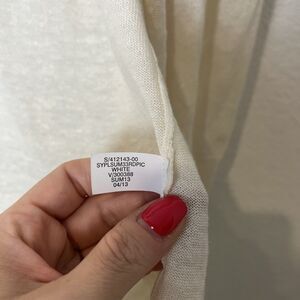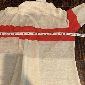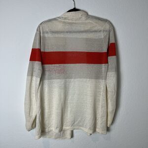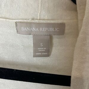The product is a Banana Republic open front 100% linen cardigan in size small, featuring a cream color with subtle red accents. This stylish sweater is designed for women and offers a versatile and comfortable option for everyday wear. Made from high-quality linen material, the cardigan is perfect for layering over any outfit and adds a touch of sophistication to any ensemble.